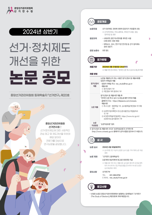 중앙선거관리위원회 선거연수원은 선거·정치제도에 대한 사회적인 관심 제고 및 제도 개선을 위하여 아래와 같이 해당 분야의 전문가를 대상으로 연구논문을 공모합니다.