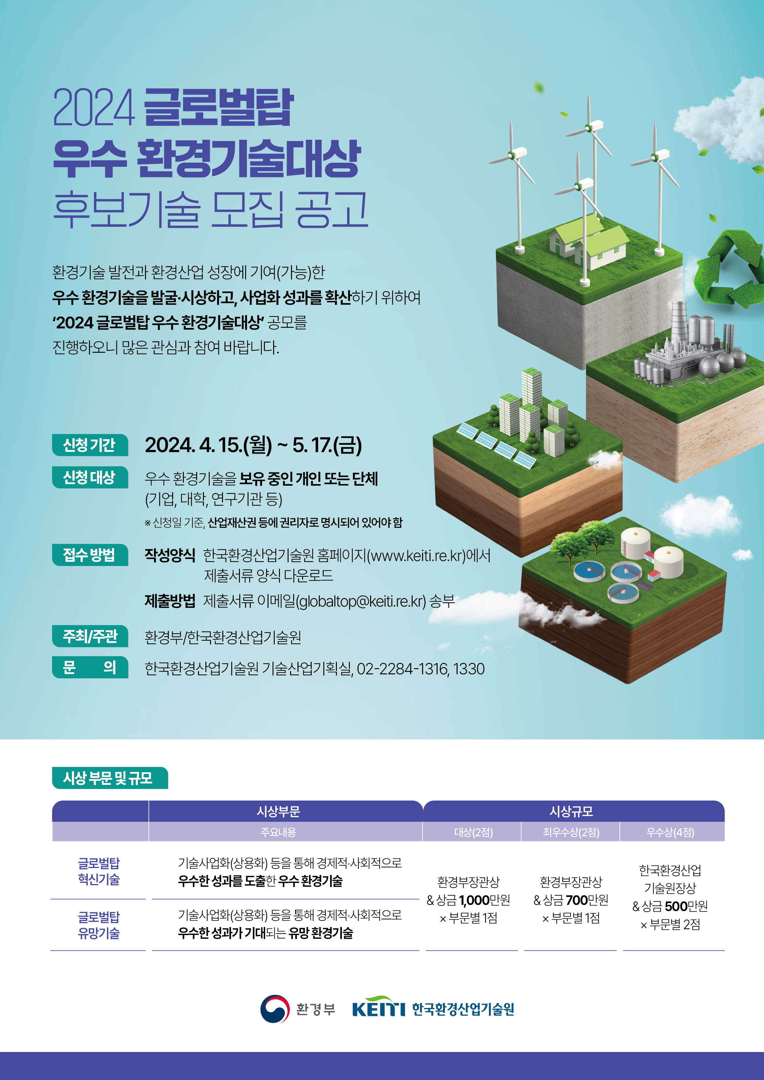 환경기술 발전과 환경산업 성장에 기여(가능)한 우수 환경기술을 발굴 및 시상하고, 사업화 성과를 확산하기 위해 「2024 글로벌탑 우수 환경 기술대상」을 첨부와 같이 공모하오니 많은 참여바랍니다.