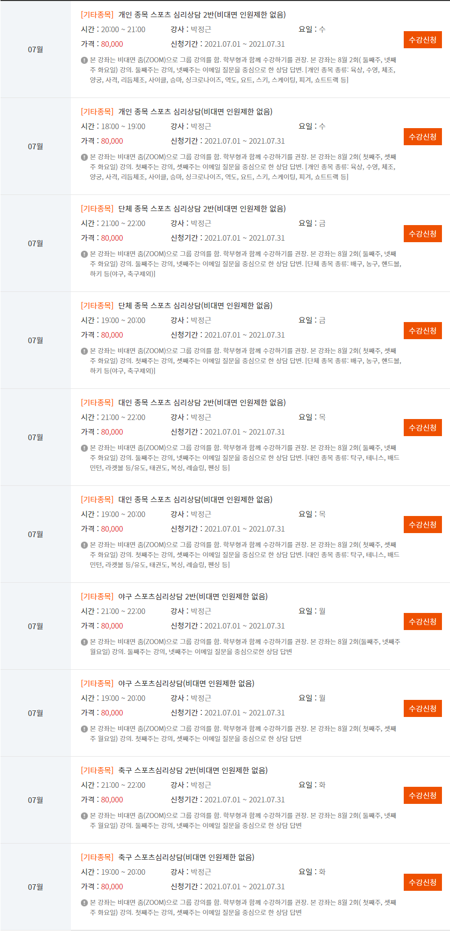 비대면 무료 스포츠심리상담(스포츠바우처) 시간표