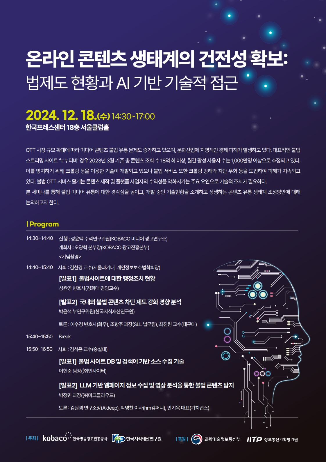 2. 한국방송광고진흥공사와 한국지식재산연구원에서 온라인 콘텐츠 생태계의 건정성 확보: 법제도 현황과 AI 기반 기술적 접근 세미나를  다음과 같이 개최합니다. 회원님들의 많은 관심 바랍니다.