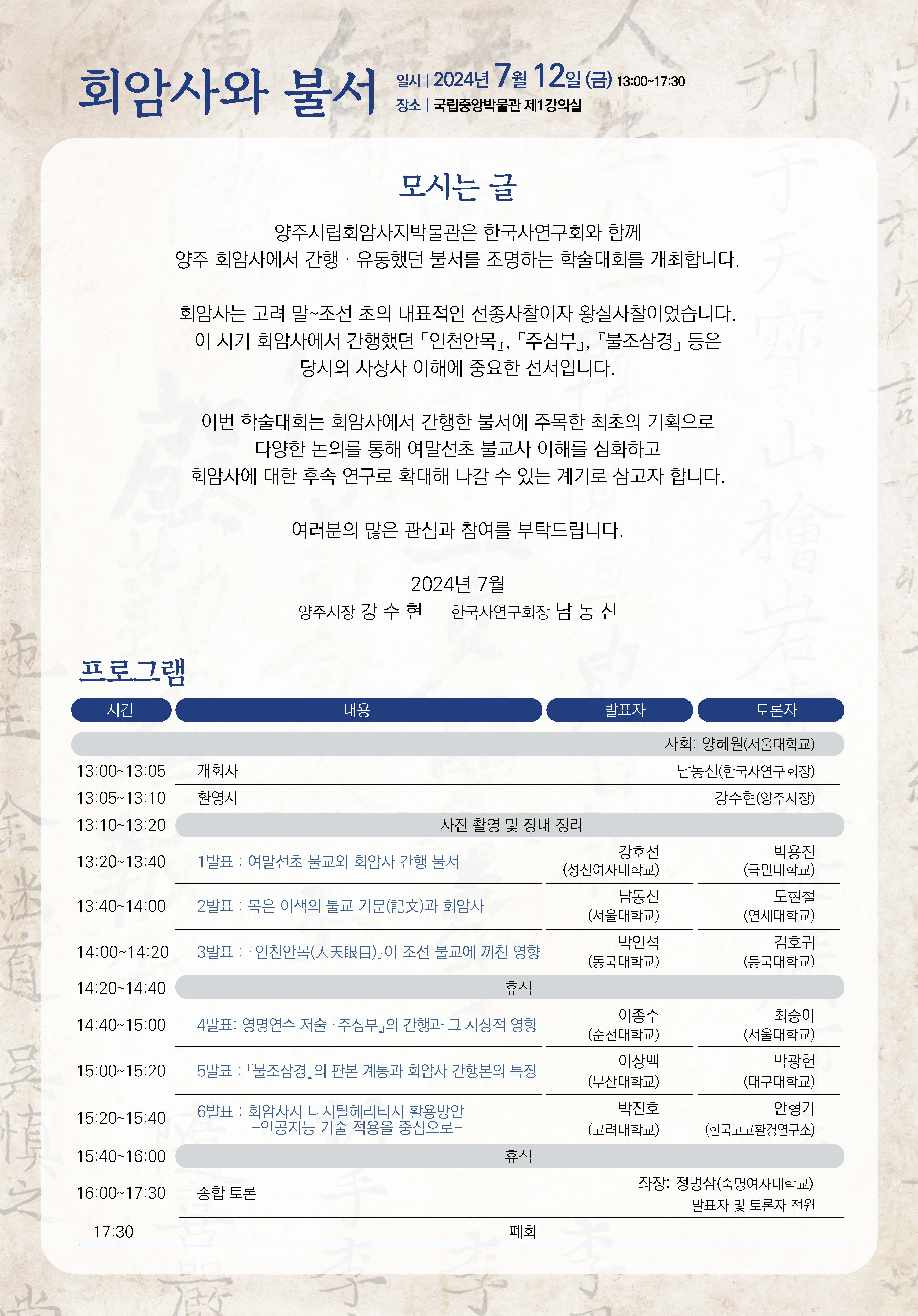 □ 주요내용 : 고려말~조선초 양주 회암사에서 간행한 불서를 조명하기 위한 발표 및 토론