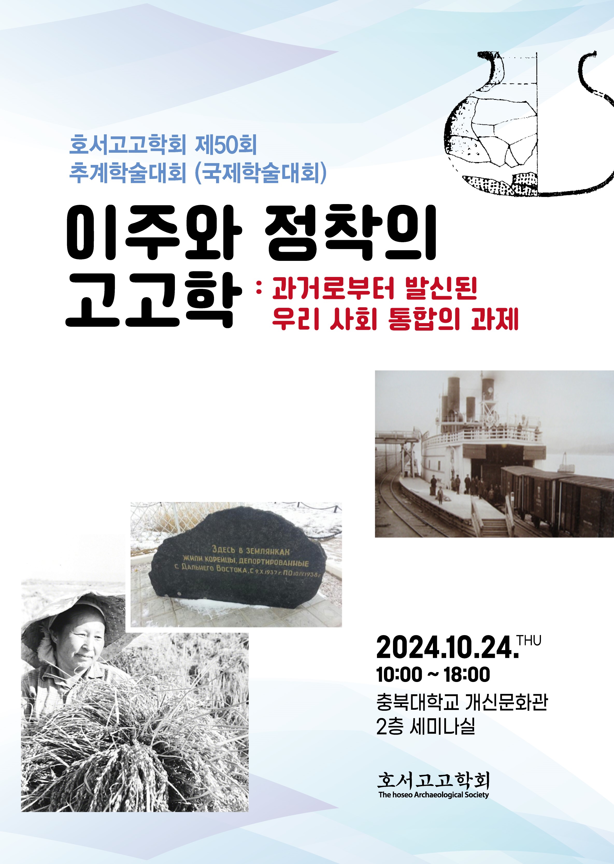 제50회 호서고고학회 정기학술대회가 10월 24일(목) 충북대학교 개신문화관 2층 세미나실에서 개최됩니다.