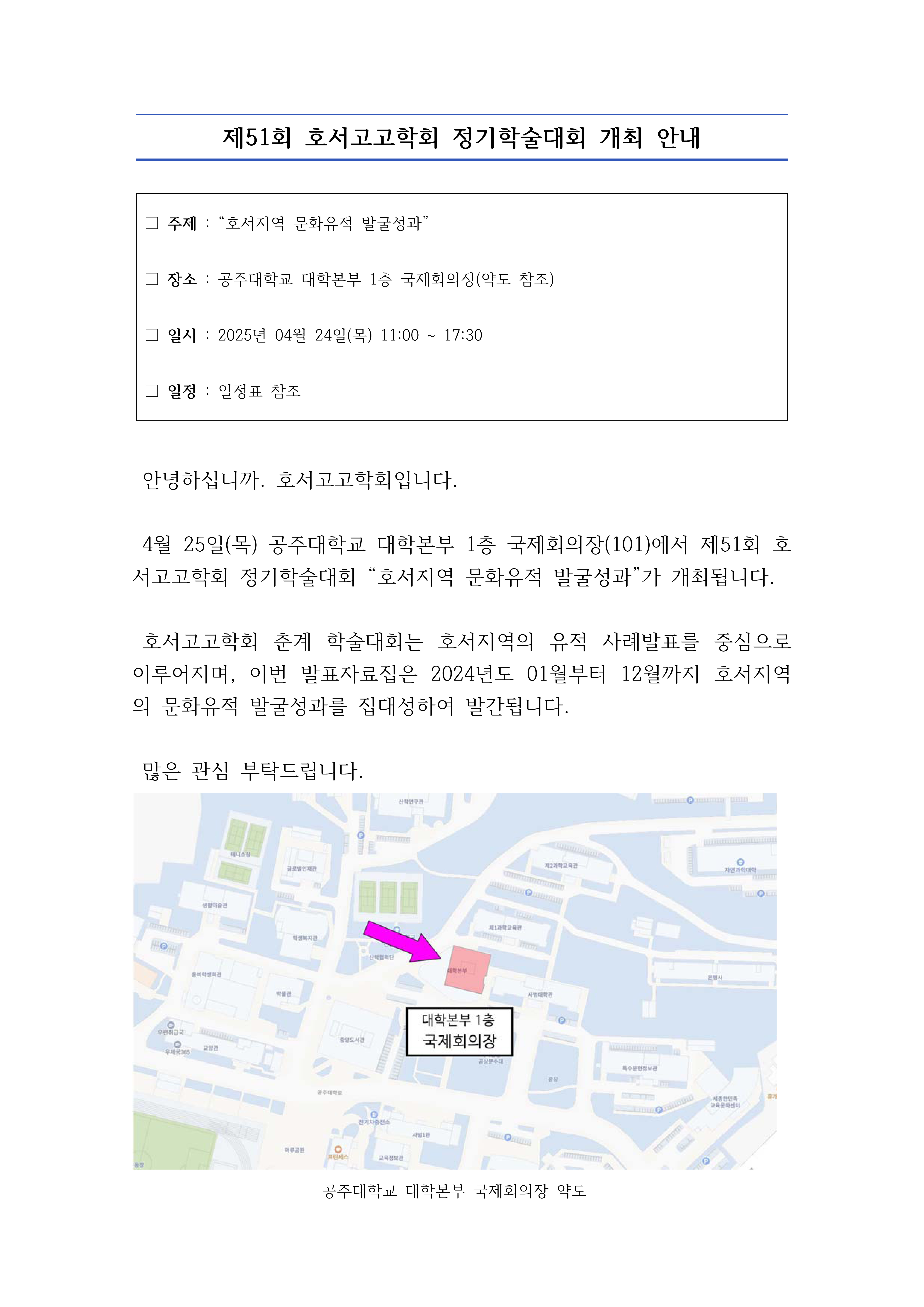 호서고고학회 제51회 정기학술대회(호서지역 문화유적 발굴성과)를 아래와 같이 개최하오니,