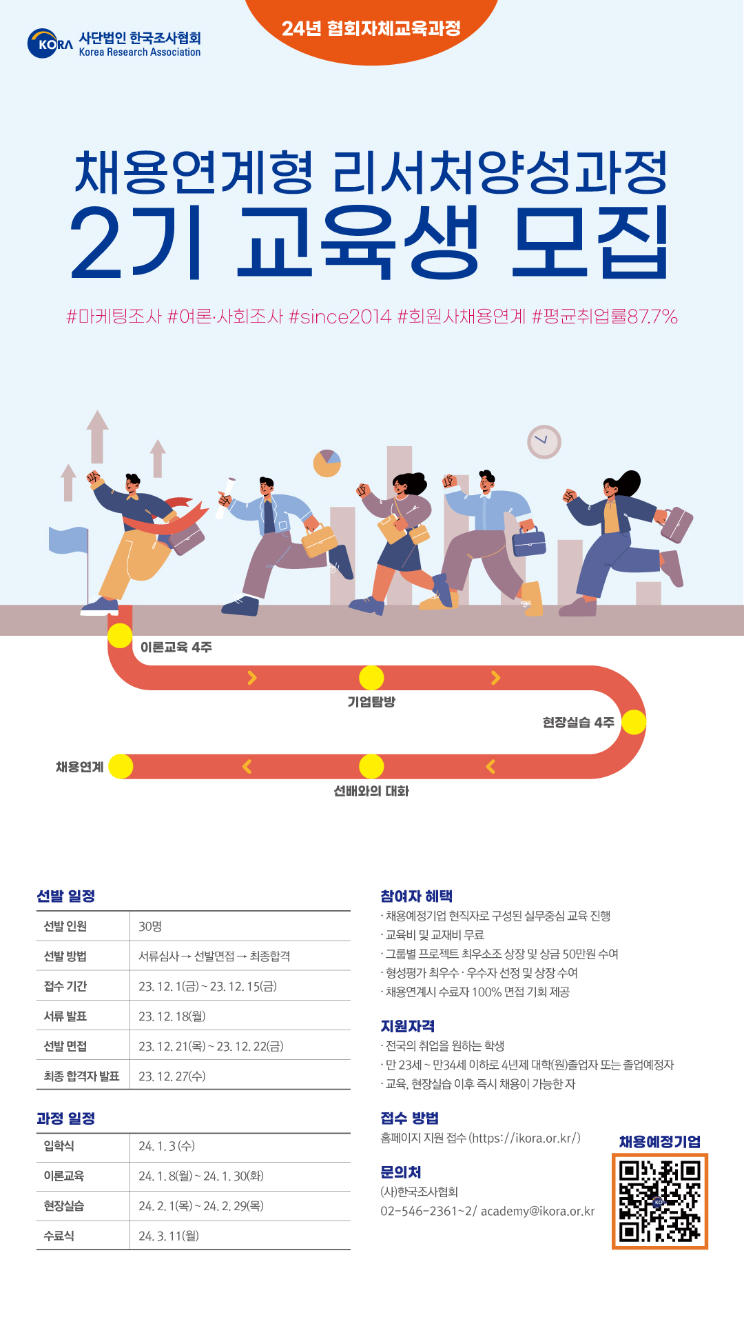 ()한국조사협회가 마케팅, 여론/사회조사 리서처를 꿈꾸는 전국의 취업을 원하는 학생들을 대상으로 교육, 현장실습 이후 채용연계를 진행하며,