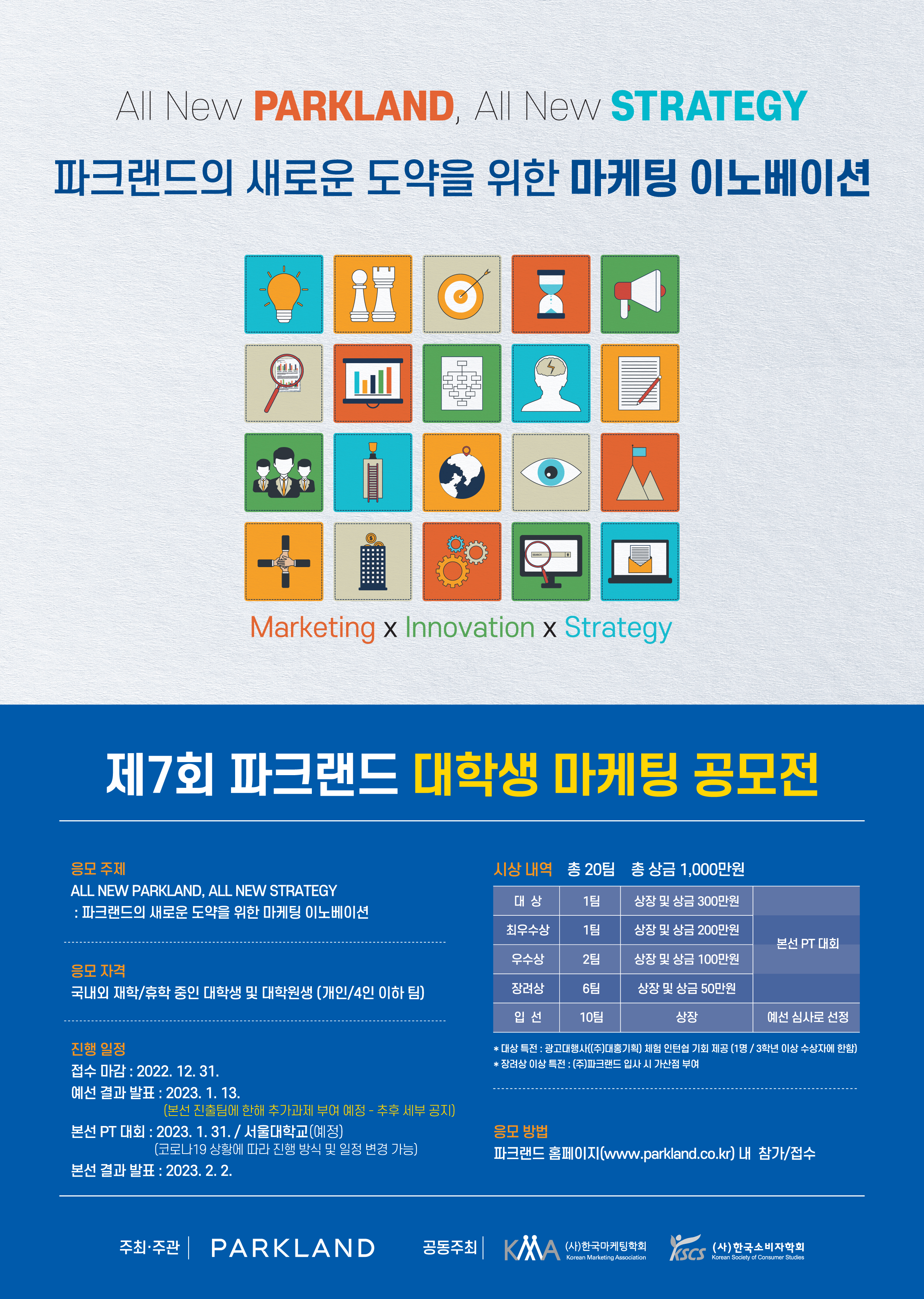 올해 공모전 주제는 ‘ALL NEW PARKLAND, ALL NEW STRATEGY : 파크랜드의 새로운 도약을 위한 마케팅 이노베이션이라는 주제로 진행됩니다.